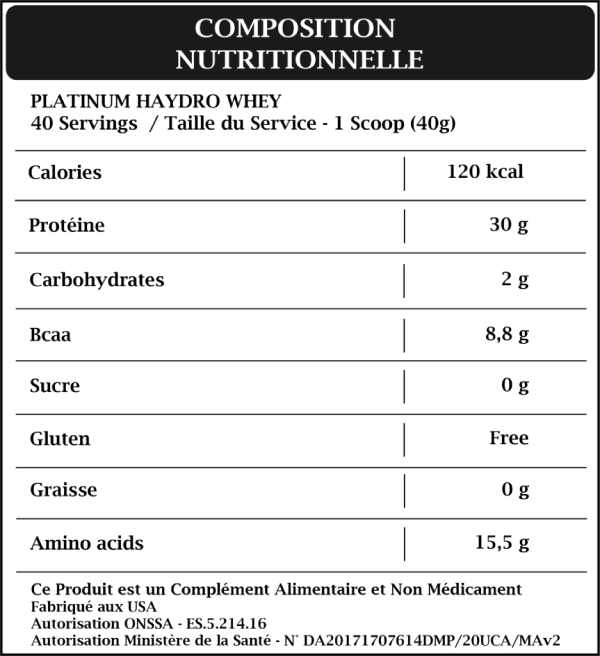 est une protéine dans sa forme la plus pure. Elle est composée uniquement de protéines de lactosérum hydrolysées qui ont été isolées pour éliminer l’excès de lactose, de cholestérol, de glucides et de lipides. Le résultat est un produit ultra-pure, rapidement digéré pour le renforcement musculaire et la reconstitution des acides aminés. 100% des protéines de Platinum Hydro Whey se distingue par sa faible teneur en matière grasse, en cholestérol et sans lactose, idéale donc pour ceux qui sont sujets aux intolérances ! Il est idéal pour les personnes sous régime ou en période de sèche. Grâce à sa technique de filtration hydrolysée (séparation avec de l’eau), la protéine est devisé en petits morceaux (fractions de protéine) c’est le cas aussi pour acides aminés qui sont alors fragmentées, ce qui permet une absorption rapide, pour une digestion plus rapide et une meilleure assimilation que toutes les autres protéines. Cette formule riche en BCAA lutte contre la dégradation musculaire, améliorer la récupération et optimiser les séances d’entrainement. La protéine Platinum Hydro Whey ON est également une excellente source d’énergie pour les muscles.